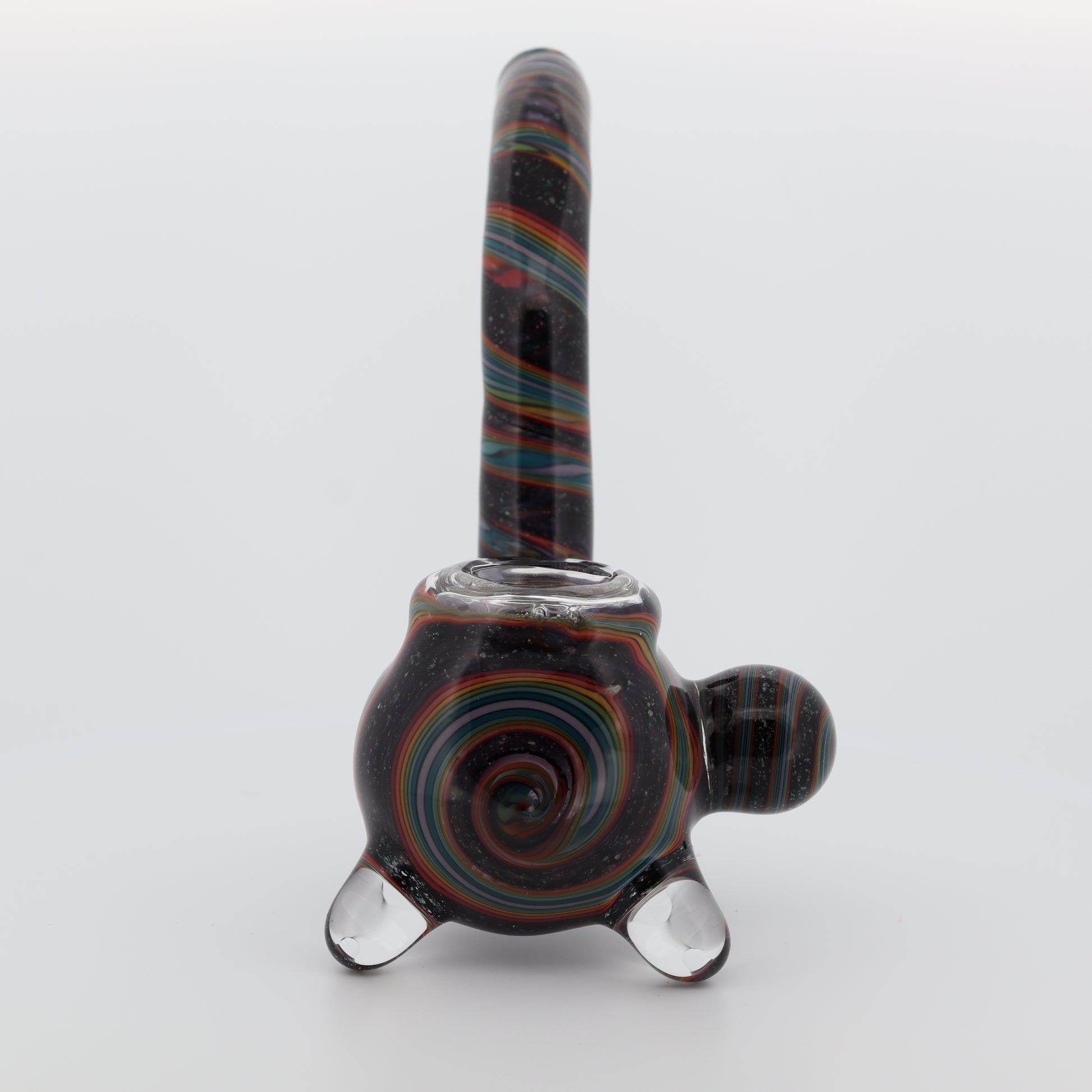The piece features layered rainbow linework wrapped over a deep black dichroic base, creating a rich, shimmering effect that reveals subtle sparkle beneath the surface. The pattern flows across the rounded chamber and continues up the neck, giving the entire piece a sense of movement and cohesion while maintaining a strong, balanced silhouette.